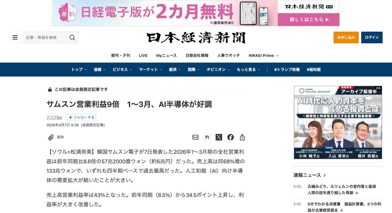 韓国サムスン電子が7日発表した2026年1~3月期の全社営業利益は前年同期比8.6倍の57兆2000億ウォン(約6兆円)だった。売上高は同68%増の133兆ウォンで、いずれも四半期ベースで過去最高だった。人工知能(AI)向け半導体の需要拡大が続いたことが大きい。