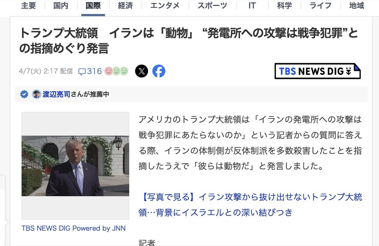 トランプ大統領 イランは「動物」 “発電所への攻撃は戦争犯罪”との指摘めぐり発言(TBS NEWS DIG Powered by JNN) - Yahoo!ニュース