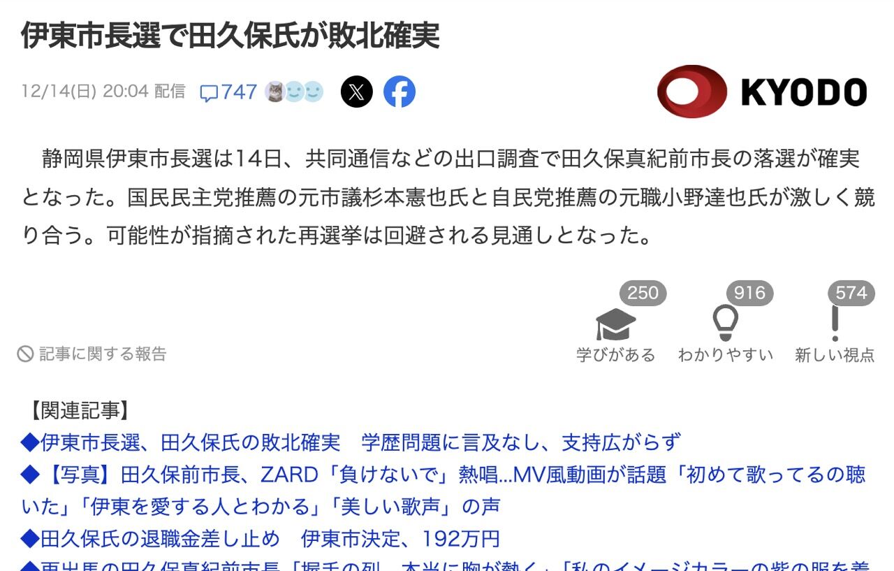 【悲報】伊東市長選、田久保眞紀元市長 落選