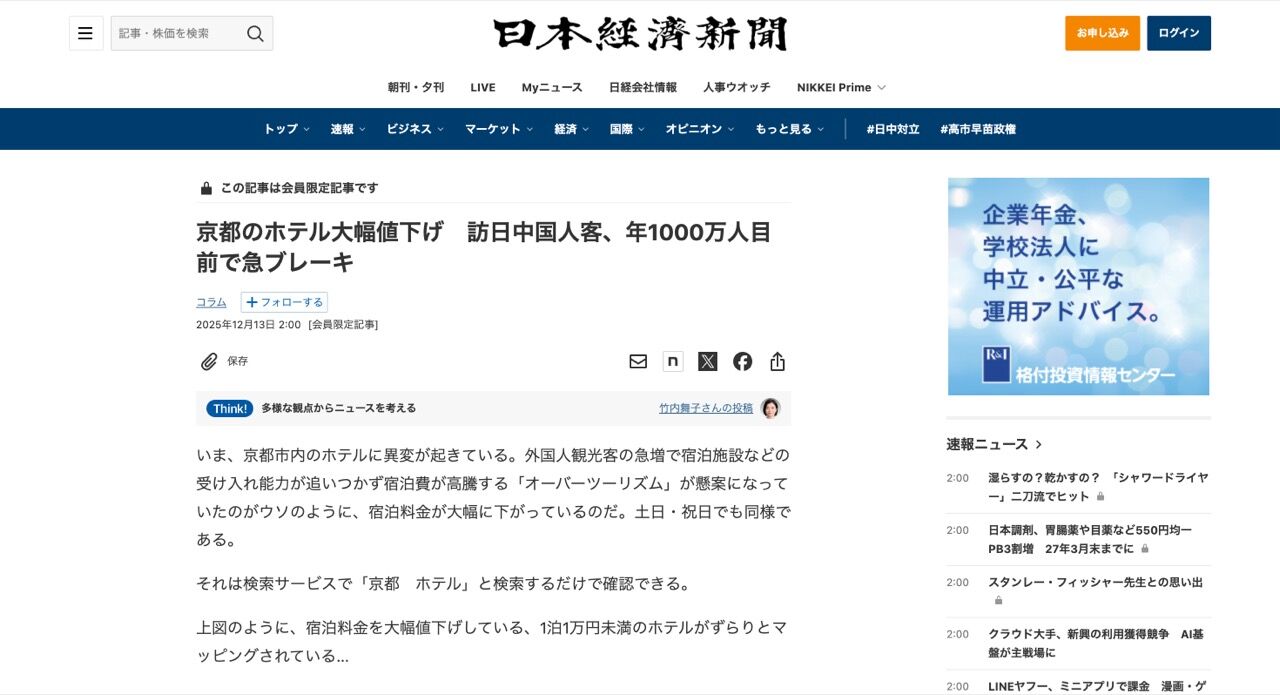 京都のホテル価格、大暴落