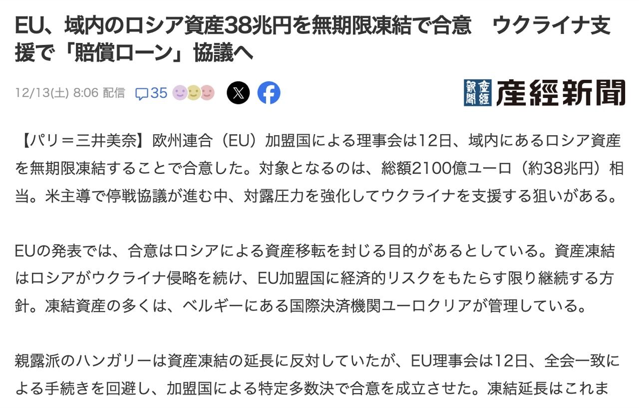 欧州連合(EU)加盟国による理事会は12日、域内にあるロシア資産を無期限凍結することで合意した。対象となるのは、総額2100億ユーロ(約38兆円)相当。米主導で停戦協議が進む中、対露圧力を強化してウクライナを支援する狙いがある。