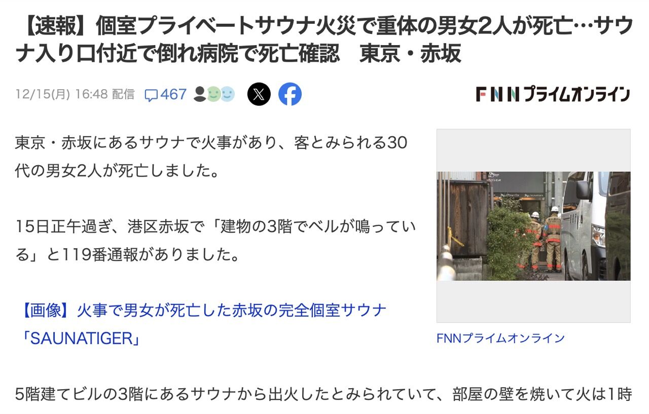 【東京】個室プライベートサウナで火災、男女2人が死亡