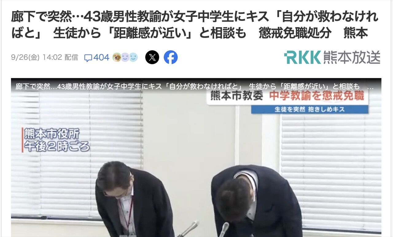 熊本市教育委員会は、市立中学校の男性教諭(43)を9月26日付で懲戒免職処分としたと発表しました。