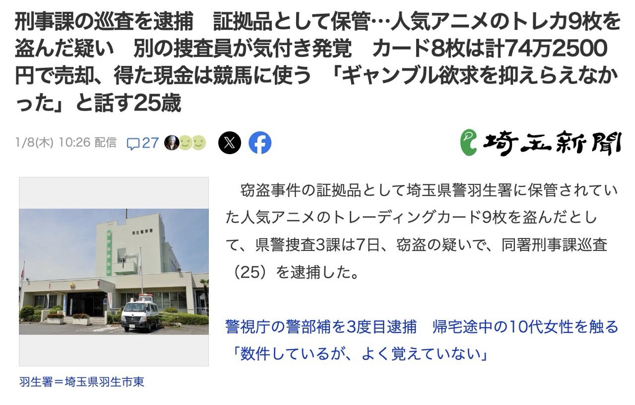 刑事課の巡査を逮捕 証拠品として保管…人気アニメのトレカ9枚を盗んだ疑い 別の捜査員が気付き発覚 カード8枚は計74万2500円で売却、得た現金は競馬に使う 「ギャンブル欲求を抑えらえなかった」と話す25歳(埼玉新聞) - Yahoo!ニュース