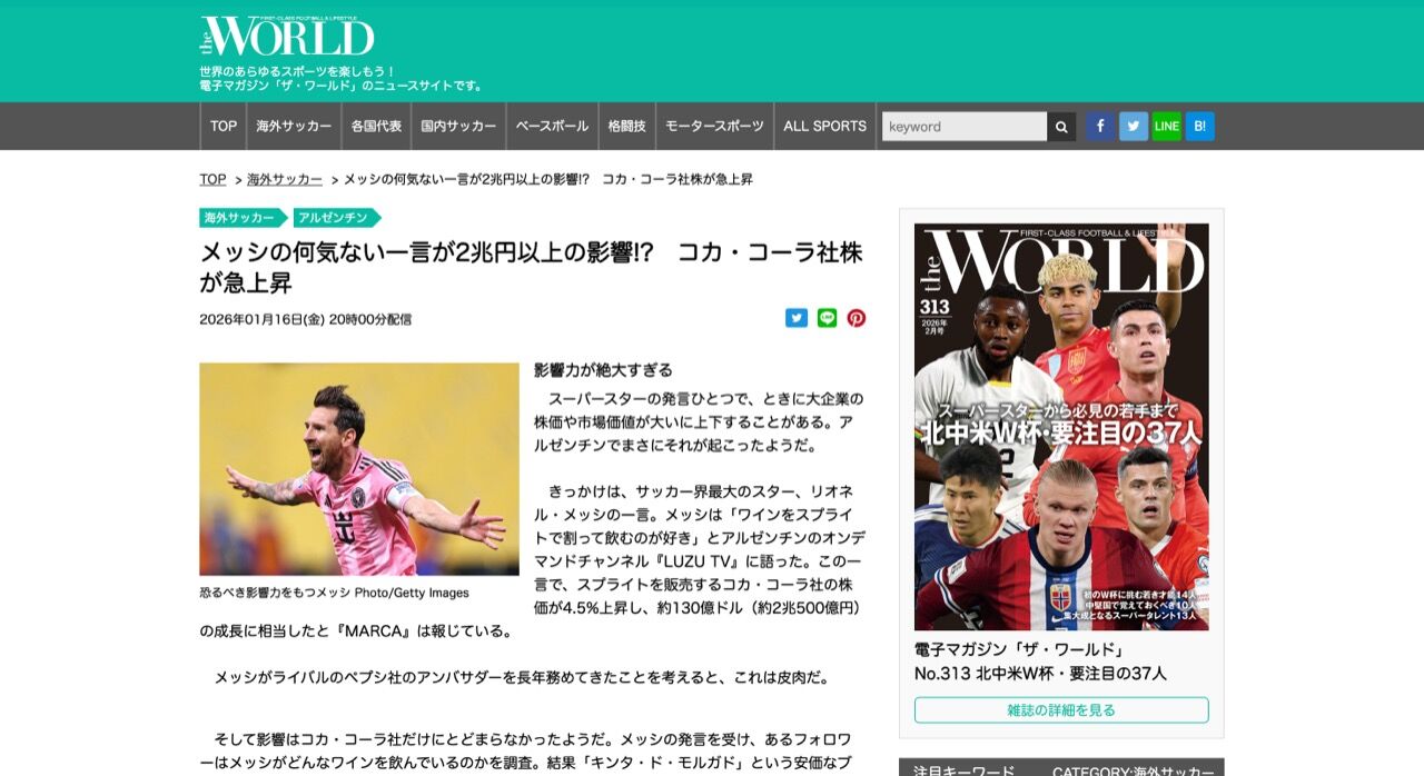 きっかけは、サッカー界最大のスター、リオネル・メッシの一言。メッシは「ワインをスプライトで割って飲むのが好き」とアルゼンチンのオンデマンドチャンネル『LUZU TV』に語った。この一言で、スプライトを販売するコカ・コーラ社の株価が4.5%上昇し、約130億ドル(約2兆500億円)の成長に相当したと『MARCA』は報じている。