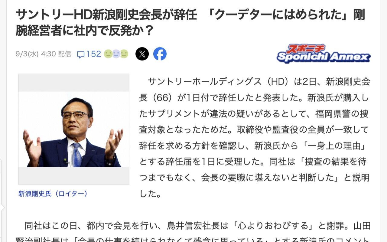 サントリーHD新浪剛史会長が辞任 「クーデターにはめられた」剛腕経営者に社内で反発か?(スポニチアネックス) - Yahoo!ニュース