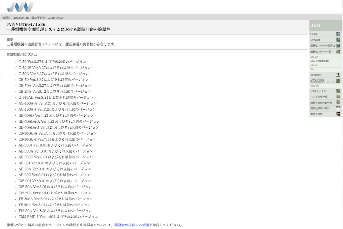 Japan Vulnerability Notes(JVN)は6月26日、三菱電機製空調管理システムに関する脆弱性情報を公開した。同日付で、三菱電機も対処法を案内している。
