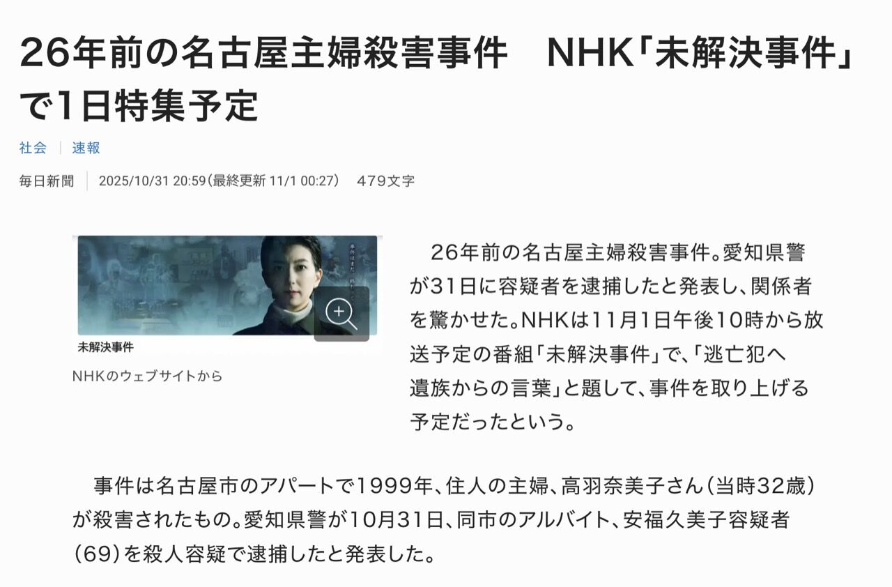 26年前の名古屋主婦殺害事件。愛知県警が31日に容疑者を逮捕したと発表し、関係者を驚かせた。NHKは11月1日午後10時から放送予定の番組「未解決事件」で、「逃亡犯へ 遺族からの言葉」と題して、事件を取り上げる予定だったという。
