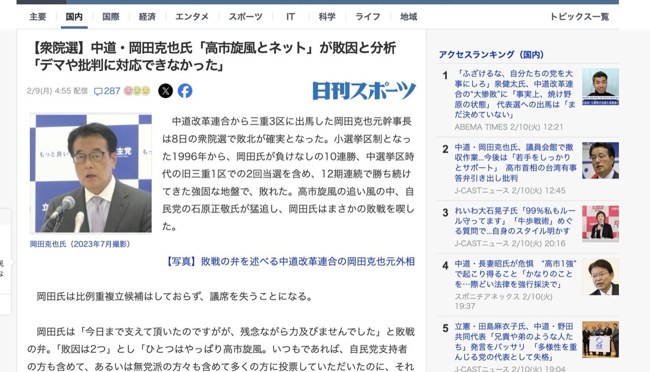 岡田氏は「今日まで支えて頂いたのですがが、残念ながら力及びませんでした」と敗戦の弁。「敗因は2つ」とし「ひとつはやっぱり高市旋風。いつもであれば、自民党支持者の方も含めて、あるいは無党派の方々も含めて多くの方に投票していただいたのに、それがぐっと自民党に引き寄せられてしまった」。続けて「もうひとつはネットですね。ネットを見ている人の支持が自民党に行った。そうとういろんなデマや批判が渦巻いていましたので、それに十分対応することができなかった」と述べた。