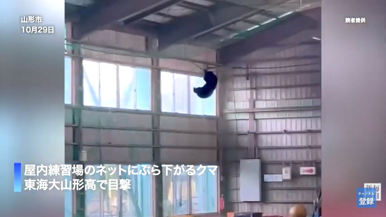 29日午前7時過ぎ、山形市成沢西の東海大山形高校で、クマが硬式野球部屋内練習場に侵入したのを男子部員が目撃した。クマは練習場内のネットに登るなど動き回った後、外に出て、学校近くの河川敷のやぶに逃げた。けが人はいなかった。