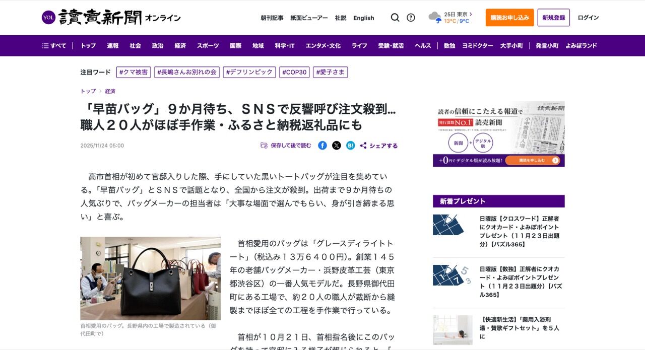 「早苗バッグ」9か月待ち、SNSで反響呼び注文殺到…職人20人がほぼ手作業・ふるさと納税返礼品にも : 読売新聞
