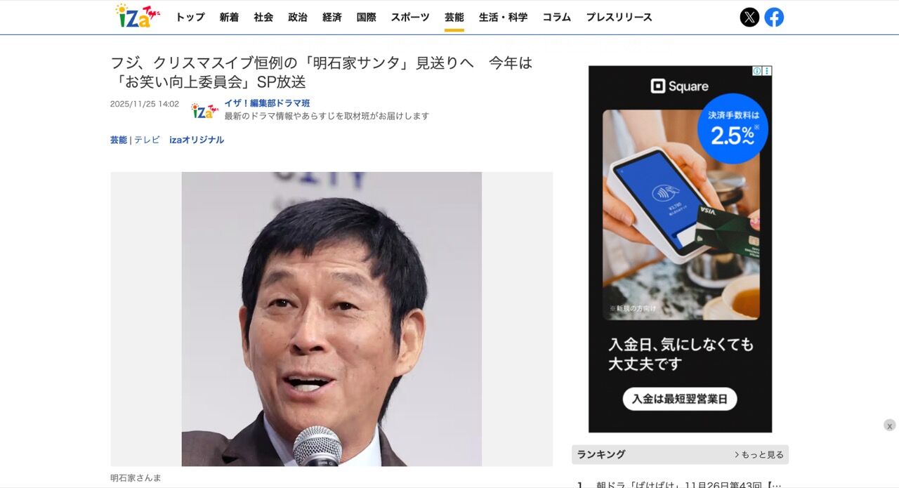 フジ、クリスマスイブ恒例の「明石家サンタ」見送りへ 今年は「お笑い向上委員会」SP放送