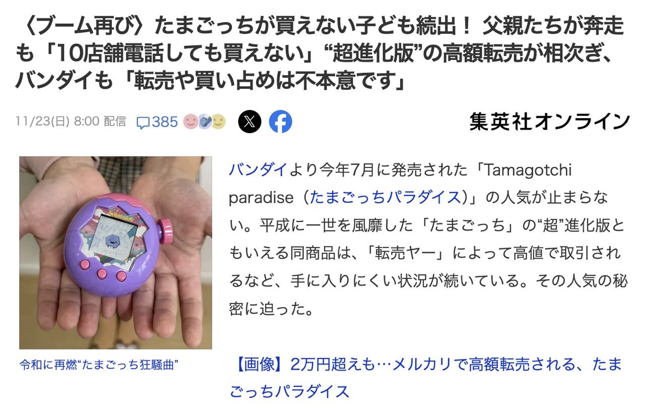 バンダイより今年7月に発売された「Tamagotchi paradise(たまごっちパラダイス)」の人気が止まらない。平成に一世を風靡した「たまごっち」の“超”進化版ともいえる同商品は、「転売ヤー」によって高値で取引されるなど、手に入りにくい状況が続いている。その人気の秘密に迫った。