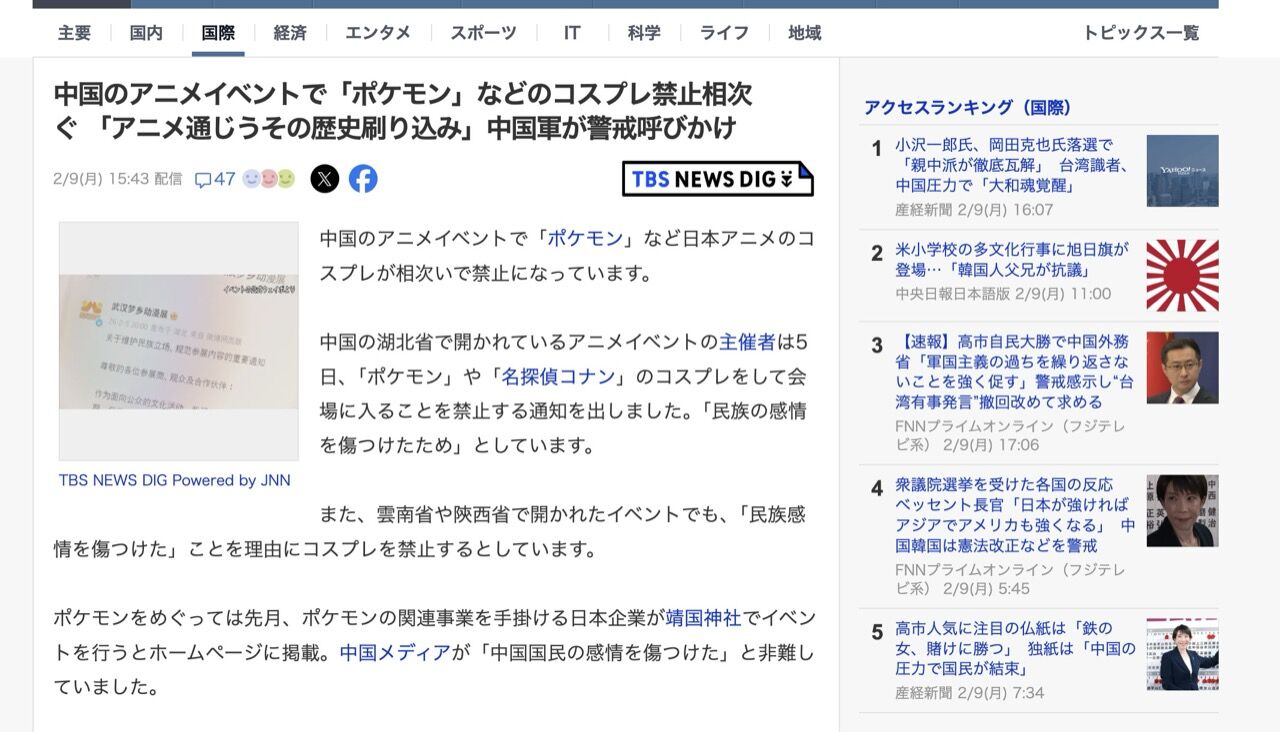 中国のアニメイベントで「ポケモン」など日本アニメのコスプレが相次いで禁止になっています。