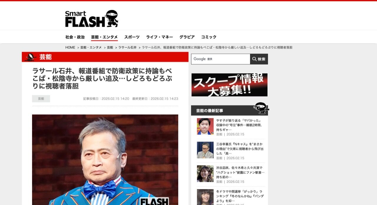 「この日、ラサール氏は、日本の防衛政策について『抑止力って言って、武器をいっぱい買う。でもたぶん、それも若干、アメリカに買わされてる』などと発言しました。防衛と言いつつ、日本が軍備を増強している現状を危惧したのです」(芸能担当記者)