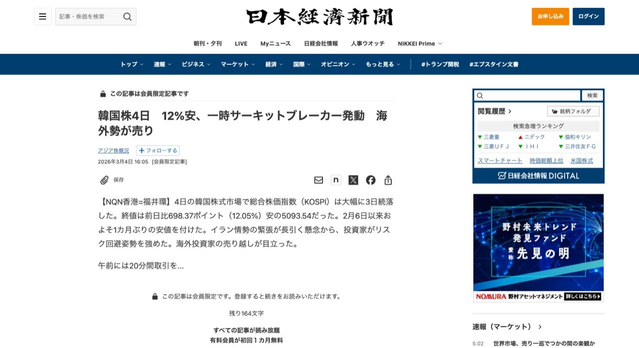 韓国株4日 12%安、一時サーキットブレーカー発動 海外勢が売り - 日本経済新聞