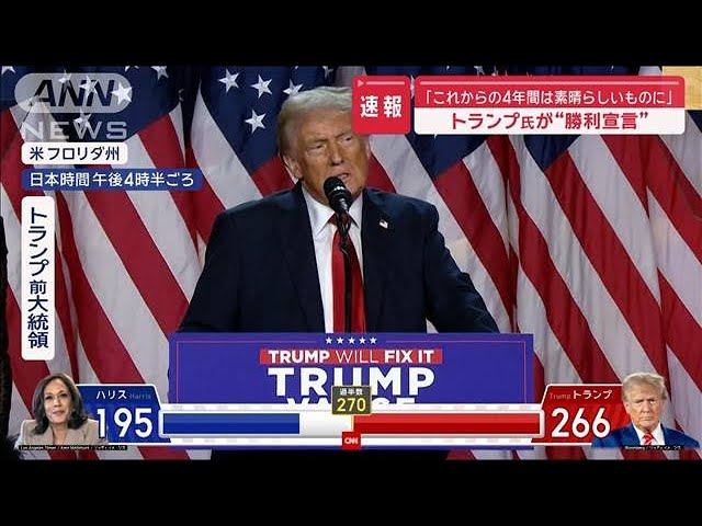 アメリカ大統領選挙で、トランプ氏が日本時間午後4時半ごろ、フロリダ州の集会場に姿を現し、勝利宣言を行いました。