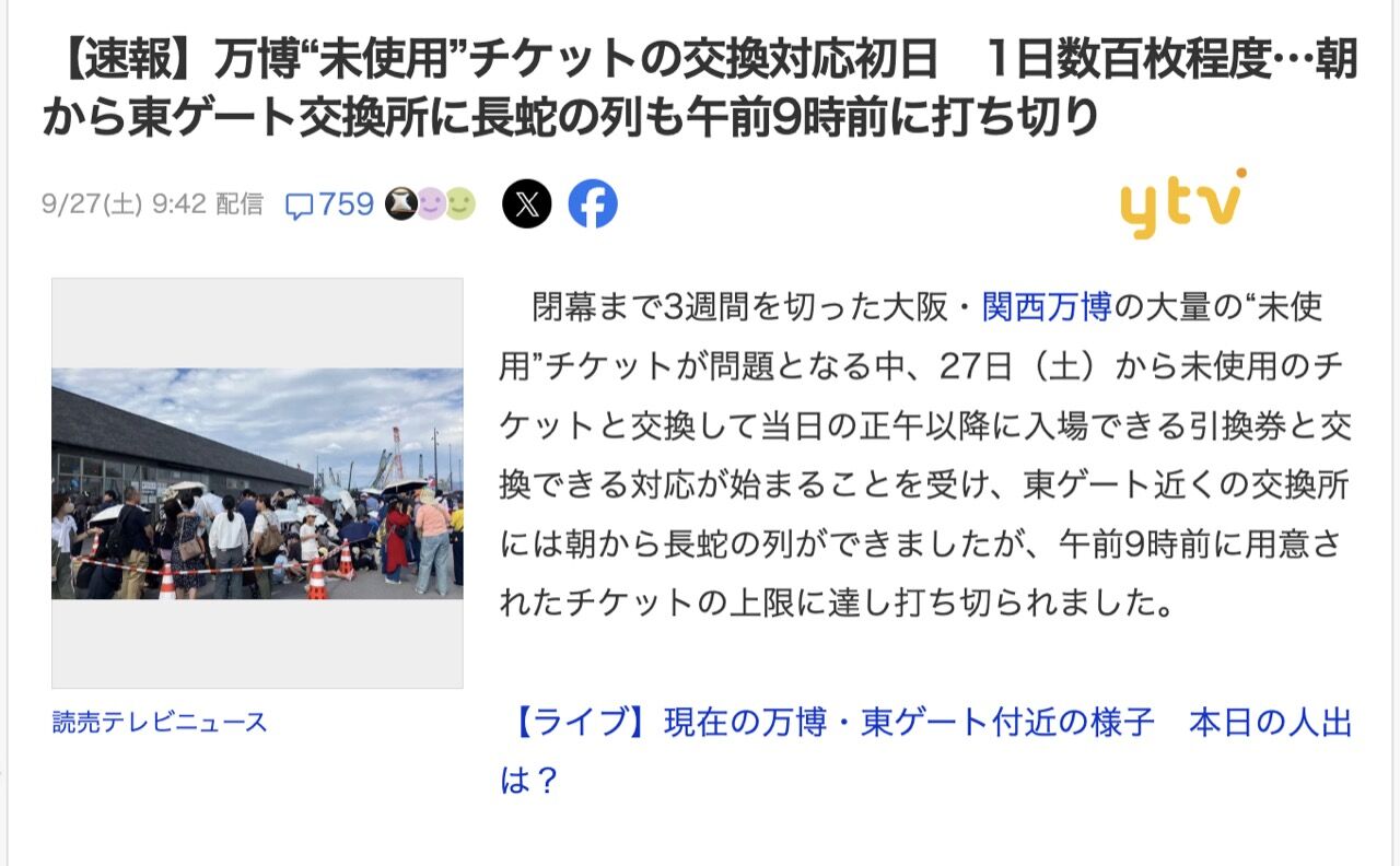 【速報】万博“未使用”チケットの交換対応初日 1日数百枚程度…朝から東ゲート交換所に長蛇の列も午前9時前に打ち切り(読売テレビ) - Yahoo!ニュース