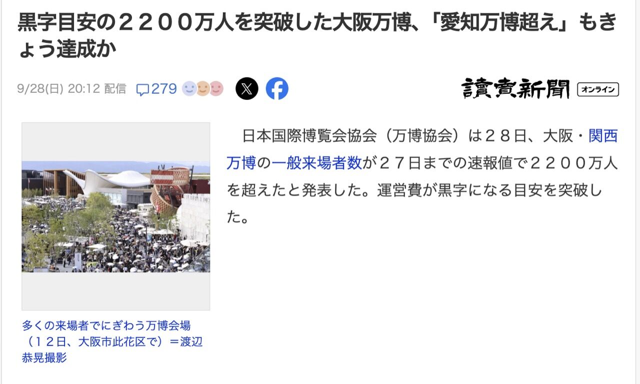 2005年の愛知万博では、目標の1500万人を大きく上回る約2205万人が来場した。日本総合研究所関西経済研究センターの藤山光雄所長は、愛知万博と同じペースで会期末まで来場者数が右肩上がりとなった場合、2500万人超に達すると予想。「9月下旬からは真夏の暑さが和らぐ」として、今後のさらなる増加につながると分析する。