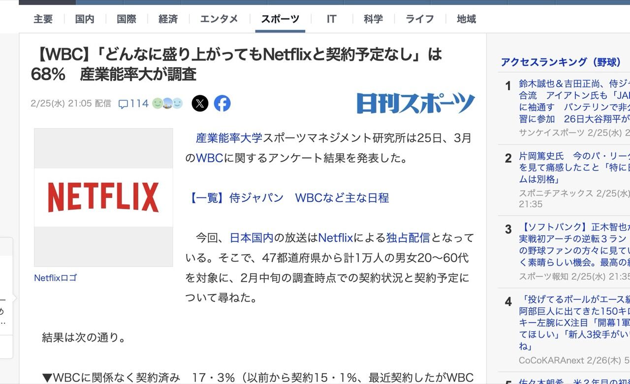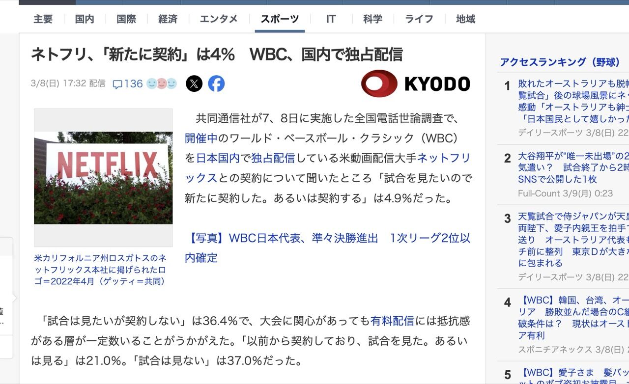 共同通信社が7、8日に実施した全国電話世論調査で、開催中のワールド・ベースボール・クラシック(WBC)を日本国内で独占配信している米動画配信大手ネットフリックスとの契約について聞いたところ「試合を見たいので新たに契約した。あるいは契約する」は4.9%だった。