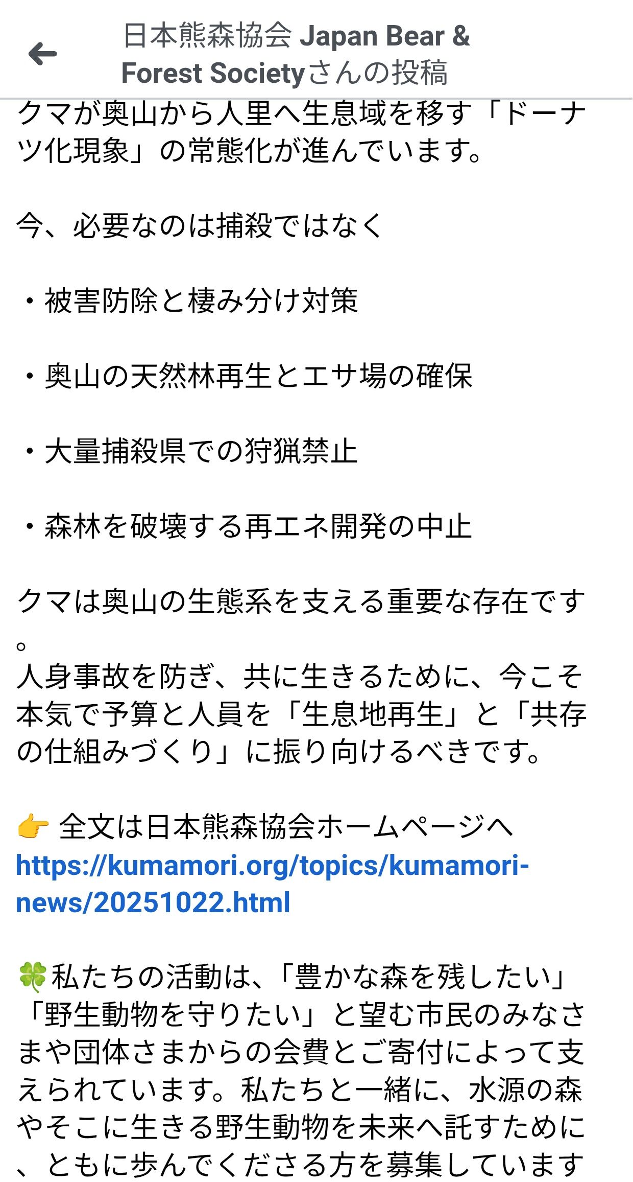 今回の秋田県美郷町のクマ駆除をめぐっては、新潟支部長が現地に駆けつけ、駆除の中止を行政側に交渉。奥山への放獣や引き取りも申し出たが、あえなく捕殺されてしまったという。
