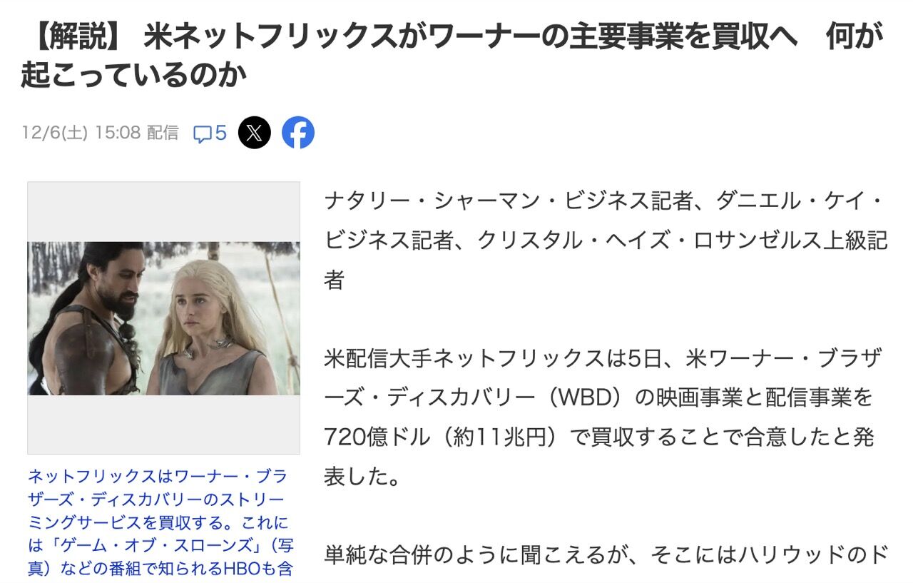 米配信大手ネットフリックスは5日、米ワーナー・ブラザーズ・ディスカバリー(WBD)の映画事業と配信事業を720億ドル(約11兆円)で買収することで合意したと発表した。単純な合併のように聞こえるが、そこにはハリウッドのドラマに必要な要素がすべて備わっている。裕福で影響力のある求婚者、政治的な駆け引き、そして数多くのクリフハンガー(続きが気になる展開)だ。(中略)この物語が展開する中で、注目すべき重要なポイントを解説する。
