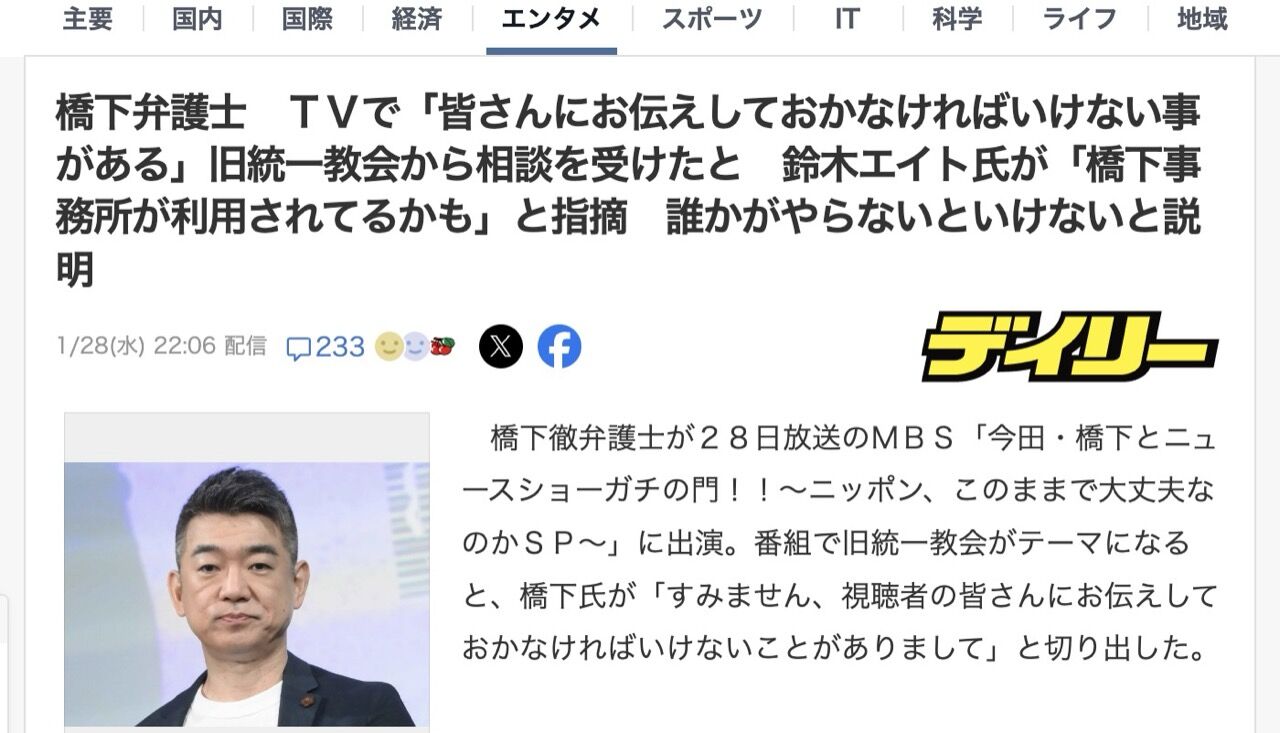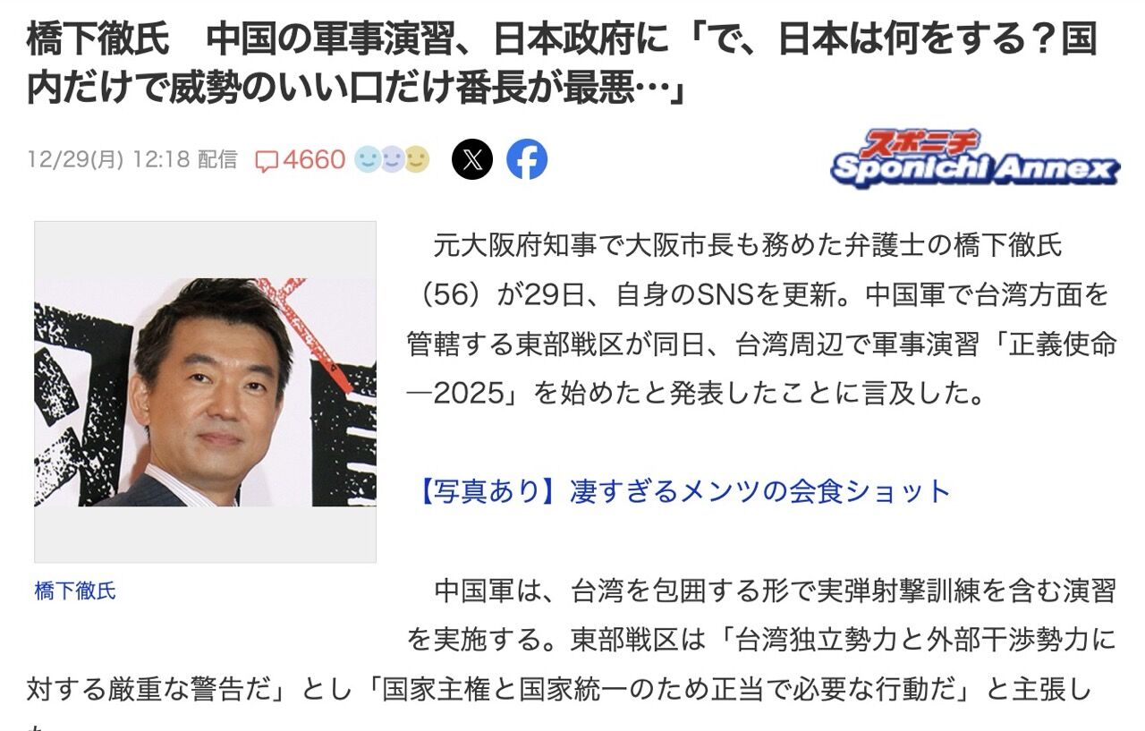 橋下氏は「『竹島の日』閣僚派遣せず 日韓関係考慮か、首相の持論封印」と題された記事を引用し、「首相の靖国参拝も竹島の日の閣僚出席も、『できないことはできない』と認めるのが誠実な政治。ここをやるやる詐欺をする高市さんはダメ。高市大応援団もダンマリ。あの威勢の良さはなんやったん?」とつづった。