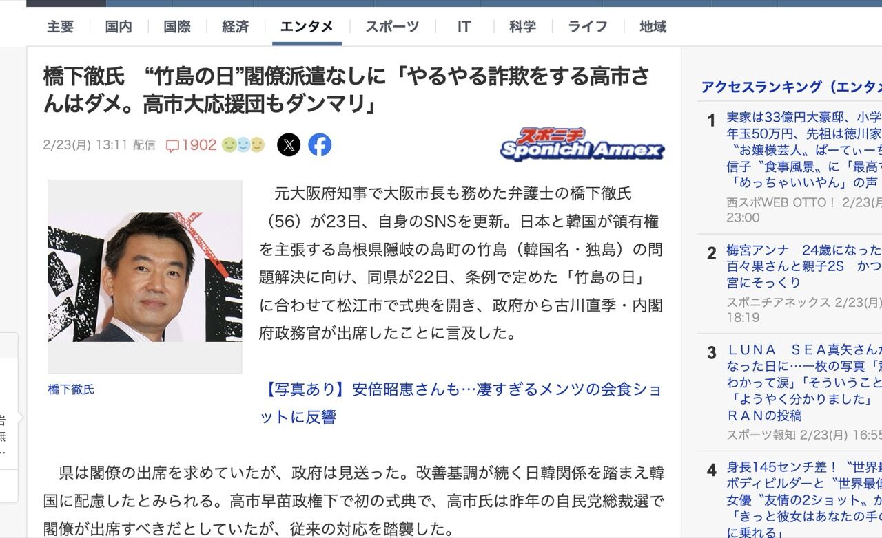 元大阪府知事で大阪市長も務めた弁護士の橋下徹氏(56)が23日、自身のSNSを更新。日本と韓国が領有権を主張する島根県隠岐の島町の竹島(韓国名・独島)の問題解決に向け、同県が22日、条例で定めた「竹島の日」に合わせて松江市で式典を開き、政府から古川直季・内閣府政務官が出席したことに言及した。