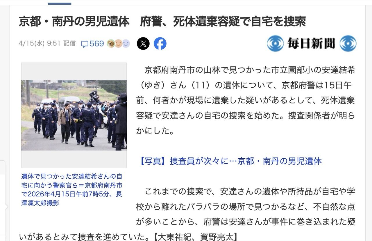 京都府南丹市の山林で見つかった市立園部小の安達結希(ゆき)さん(11)の遺体について、京都府警は15日午前、何者かが現場に遺棄した疑いがあるとして、死体遺棄容疑で安達さんの自宅の捜索を始めた。捜査関係者が明らかにした。