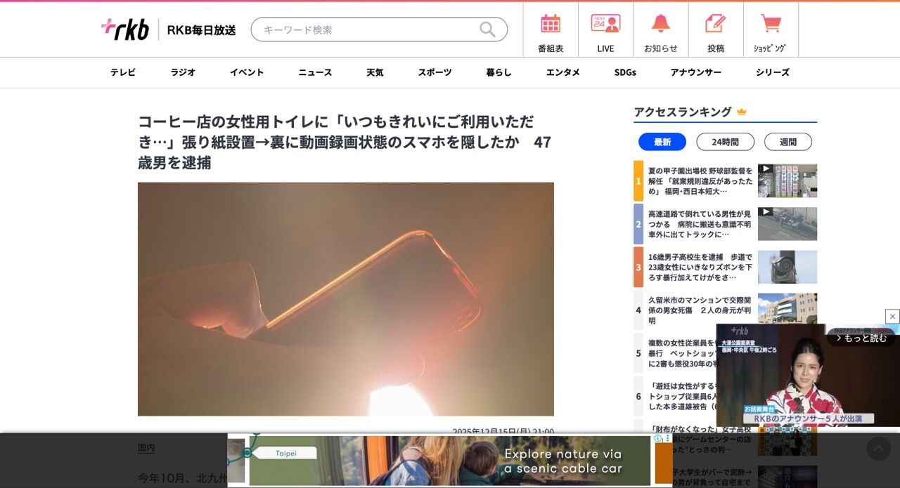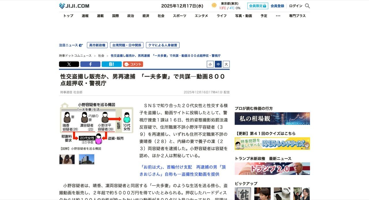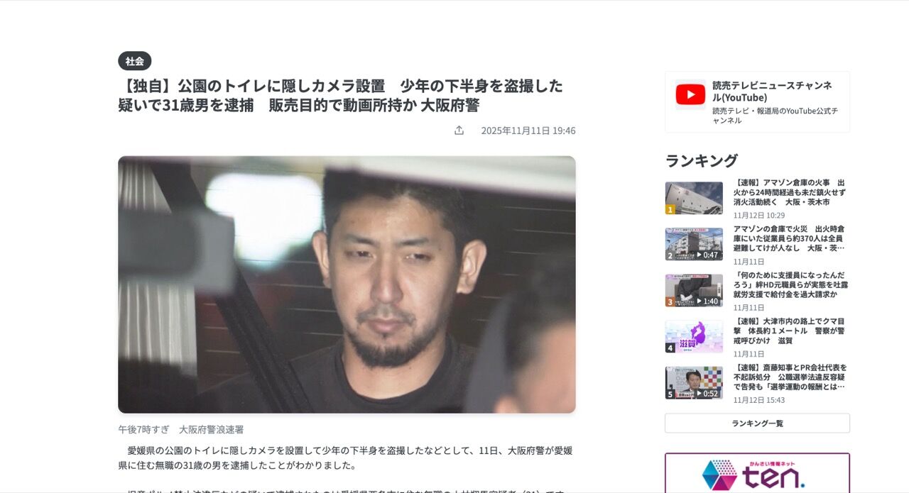 府警の説明では、自宅などを捜索した際、ハードディスク30個以上から大量の盗撮されたとみられる動画が見つかった。ファイルから、少なくとも11年前から盗撮を繰り返していたとみられ、市販のドライブレコーダーを悪用していたという。