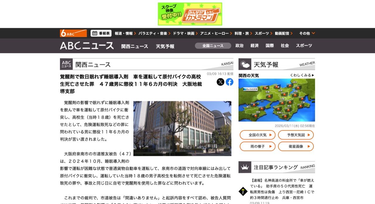 判決で大阪地裁堺支部は、市道被告が「覚醒剤によって何日も不眠状態になり、事故当日は眠ろうと考えて睡眠導入剤を服用したあとコンビニで食べ物を買うため車で出かけていて、相当に危険で強い非難に値する」と指摘しました。