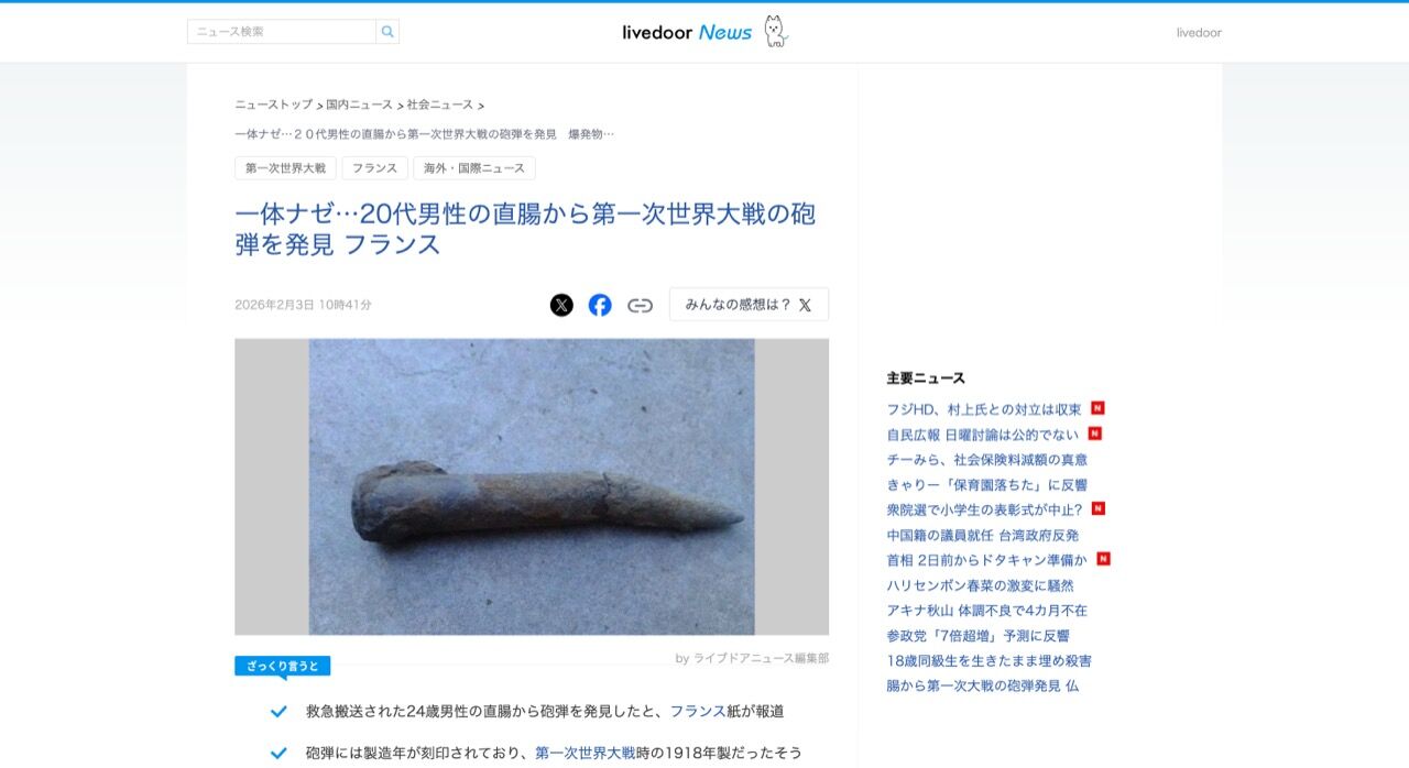 フランスのトゥールーズで、24歳の男性が直腸に第一次世界大戦の砲弾を入れた状態で病院に救急搬送され、爆発物処理班が出動した。フランス紙ル・パリジャンが先日、報じた。