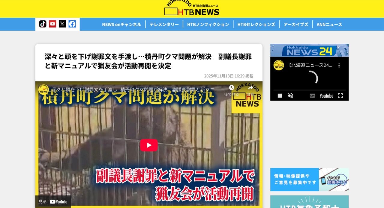 北海道の積丹町で、猟友会がクマ出没の際の出動を拒否していた問題が、町議会副議長による謝罪文書の受け渡しなどにより、ようやく解決しました。積丹町長の松井秀紀氏は「11月13日から猟友会の活動を再開していただけるという風に決定いたしました」と会見で述べました。