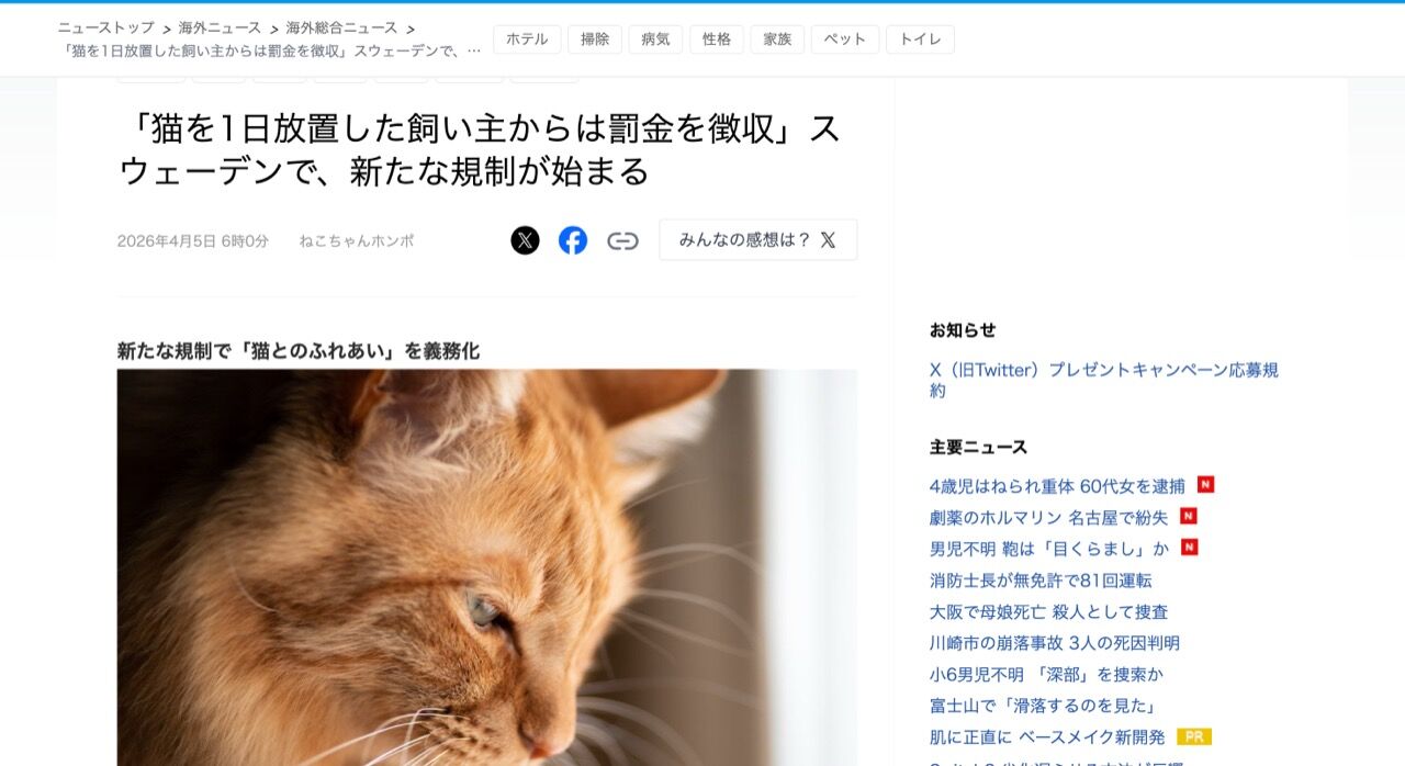 スウェーデンで、猫の飼い主に対する新しい規制が始まります。飼い猫を1日中放置した飼い主は、罰金を科せられるというものです。