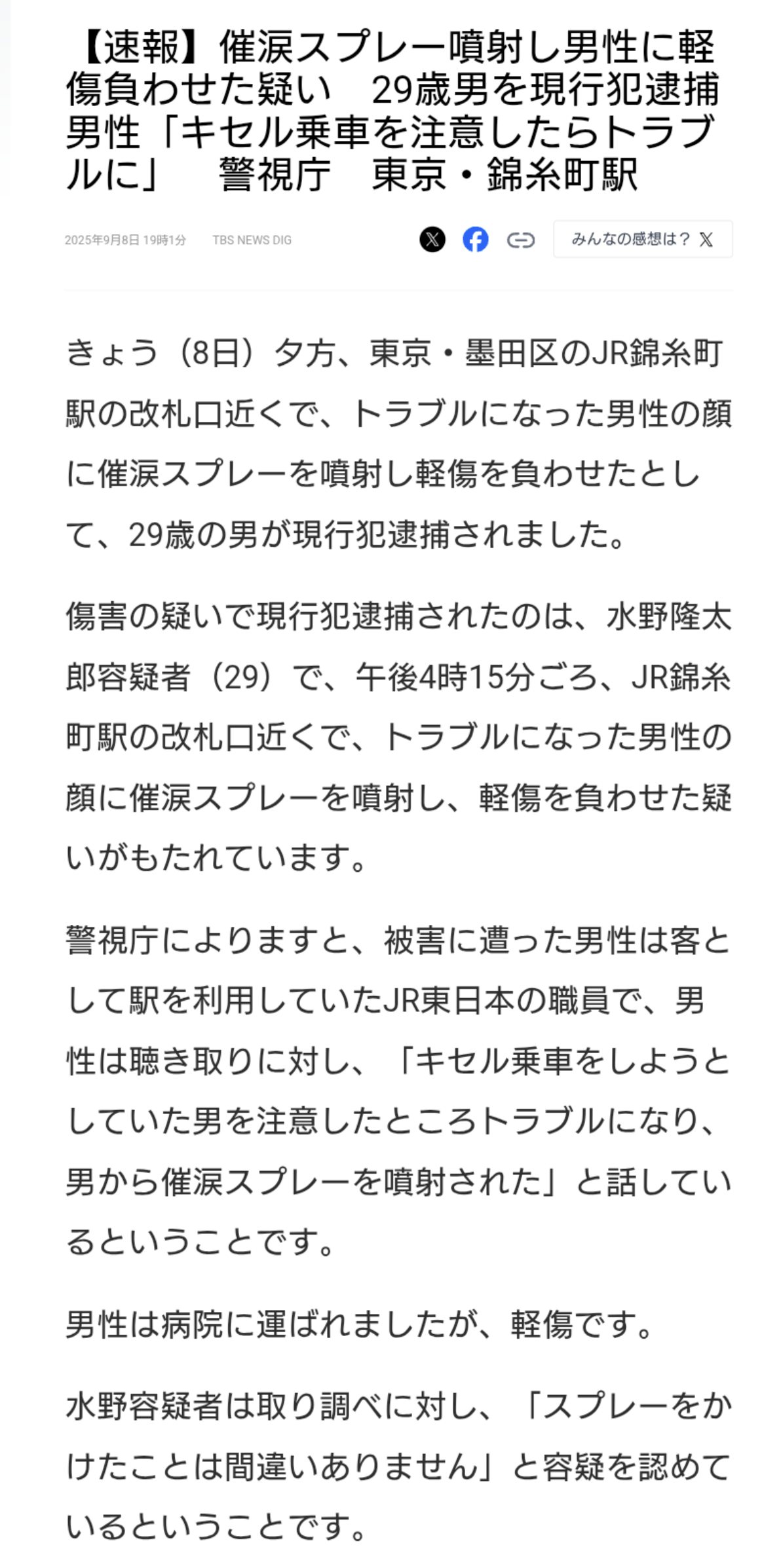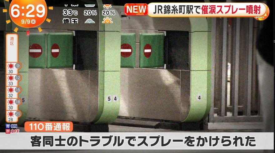 【速報】催涙スプレー噴射し男性に軽傷負わせた疑い 29歳男を現行犯逮捕 男性「キセル乗車を注意したらトラブルに」 警視庁 東京・錦糸町駅 - ライブドアニュース