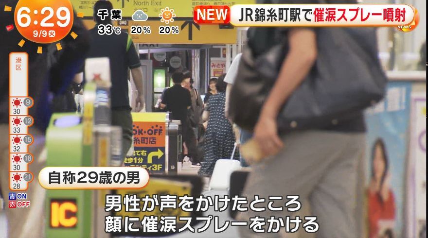 きょう(8日)夕方、東京・墨田区のJR錦糸町駅の改札口近くで、トラブルになった男性の顔に催涙スプレーを噴射し軽傷を負わせたとして、29歳の男が現行犯逮捕されました。