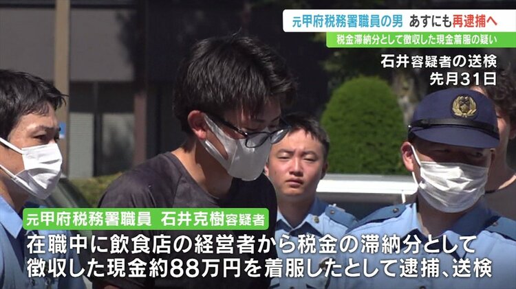 元甲府税務署職員の石井克樹容疑者は在職中に飲食店の経営者から税金の滞納分として徴収した現金およそ88万円を着服したとして先月業務上横領の疑いで逮捕・送検されています。