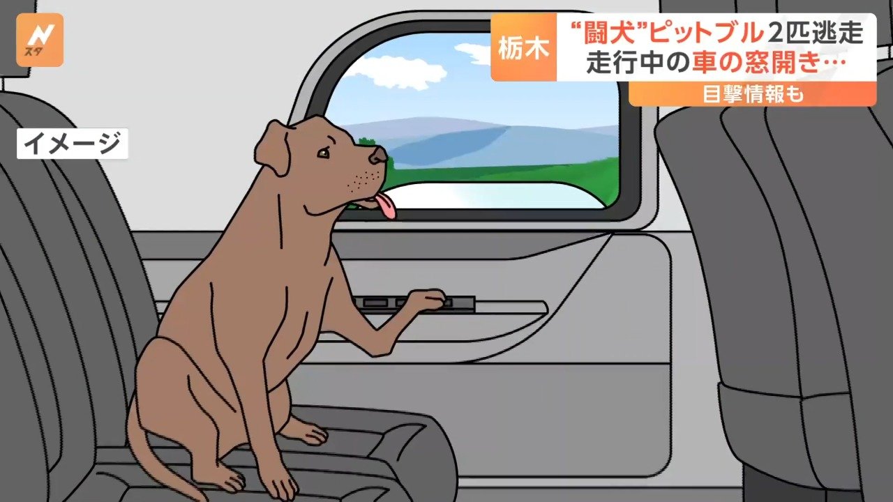 栃木県警は9日、栃木市の藤岡渡良瀬運動公園付近を走行中の車から体長約70センチの犬「アメリカンピットブルテリア」2匹が逃げ、行方不明になったと発表した。逃げたのは8日午後8時半頃。群馬県伊勢崎市の男性(47)が軽乗用車の後部座席に乗せていたところ、パワーウィンドーのボタンを押し、飛び出したとみられる。