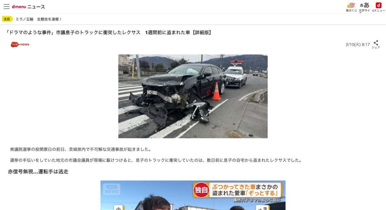 「ドラマのような事件」市議息子のトラックに衝突したレクサス 1週間前に盗まれた車【詳細版】