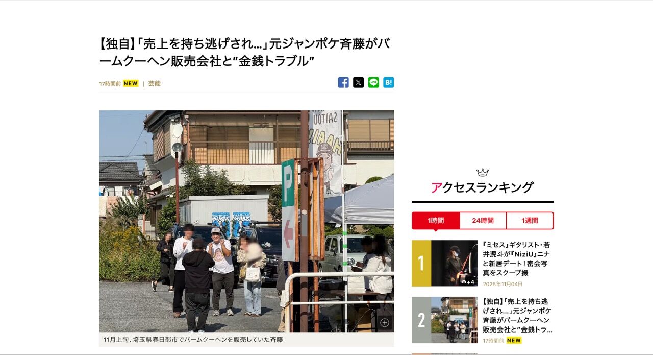 販売会社が「売り上げ金を持ち逃げされた」と被害届を提出へ...元『ジャンポケ』斉藤慎二のバームクーヘンを巡って金銭トラブルが勃発した