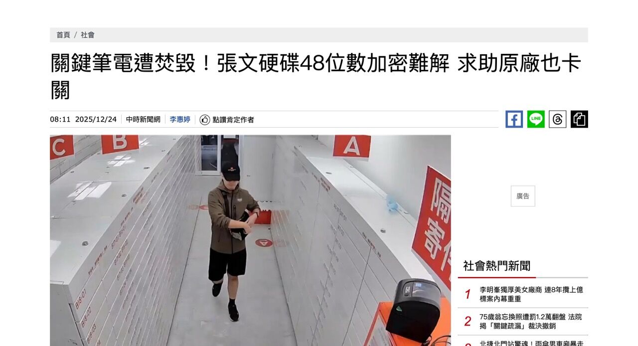 チャン・ウェンは台北で無差別路上襲撃事件に巻き込まれ、3人が死亡、11人が負傷した後、転落死し、多くの未解決の謎を残しました。捜査班は彼の賃貸アパートで焼け焦げたROGゲーミングノートPCを発見しました。ハードドライブ自体は無傷でしたが、このモデルはWindowsの「BitLocker」デジタル暗号化技術を使用していました。刑事捜査局はメーカーとマイクロソフトに協力を要請しましたが、成果はありませんでした。今後、48桁の数字からなるパスワードを総当たり方式で一つずつ試し、できるだけ早くパスワードを解読しようとしています。