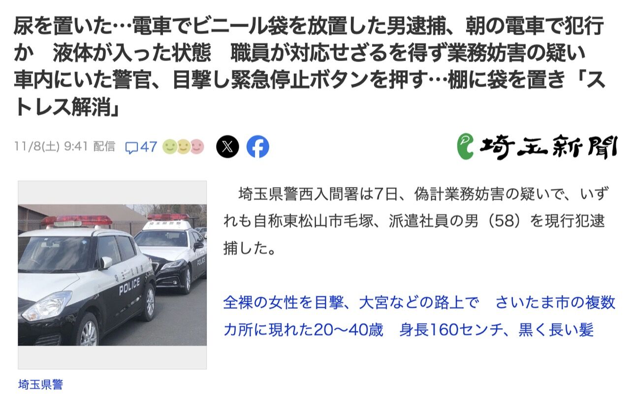 同署によると、液体が入ったビニール袋が棚に置かれる同様の事案が6月と10月に複数回あり、同社が県警に通報。今月6日朝にも発生したことから翌7日、捜査員が列車に乗り捜査。ビニール袋を棚に置いた男を見つけ確認したところ、「尿を置きました」と話したという。捜査員が列車の緊急停止ボタンを押して北坂戸駅で列車を止め、駅員が安全確認などを行った。液体は黄色だったという。男は「尿などが入った袋を置いたことは間違いない。ストレス解消のためにやった」と供述している。