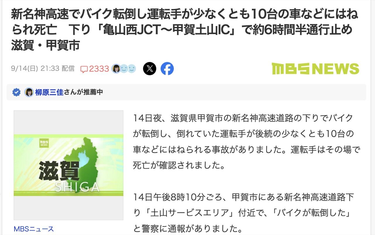 新名神高速でバイク転倒し運転手が少なくとも10台の車などにはねられ死亡 下り「亀山西JCT~甲賀土山IC」で約6時間半通行止め 滋賀・甲賀市