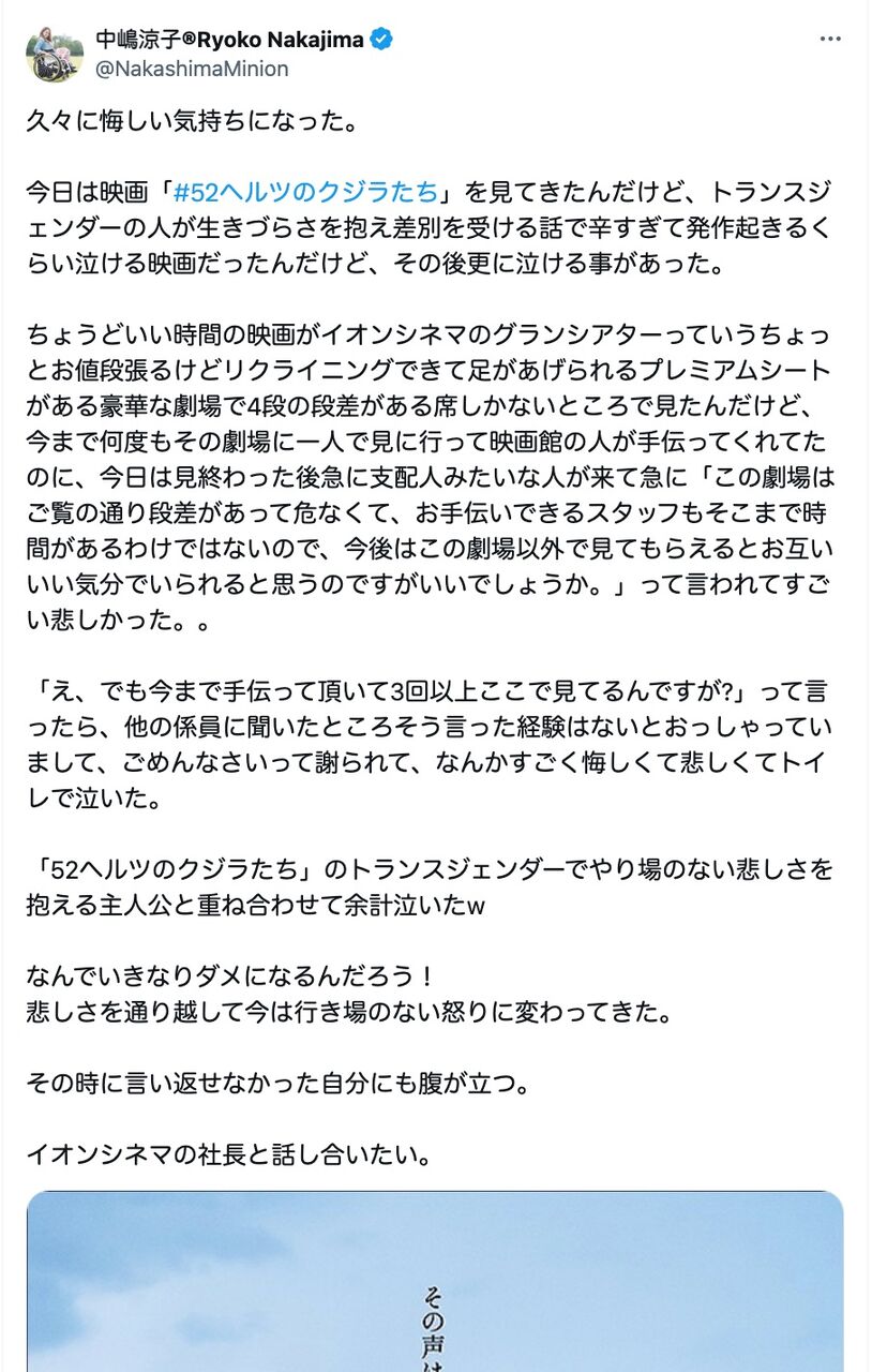 今日は映画「#52ヘルツのクジラたち」を見てきたんだけど、トランスジェンダーの人が生きづらさを抱え差別を受ける話で辛すぎて発作起きるくらい泣ける映画だったんだけど、その後更に泣ける事があった。… pic.twitter.com/T1B54UR7n1