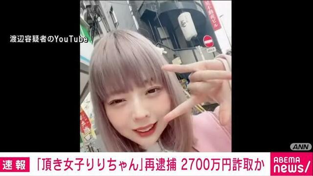 女はインターネット上で「頂き女子りりちゃん」と称して活動。今年8月には、男性から金銭的支援を受ける「パパ活」をしようとする女性に金銭を詐取するマニュアルを販売したとして詐欺ほう助容疑で逮捕されていた。女の口座には1億円以上が振り込まれていたという。