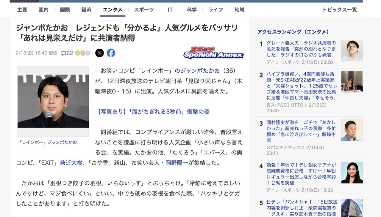 お笑いコンビ「レインボー」のジャンボたかお(36)が、12日深夜放送のテレビ朝日系「見取り図じゃん」(木曜深夜0・15)に出演。人気グルメに異論を唱えた。