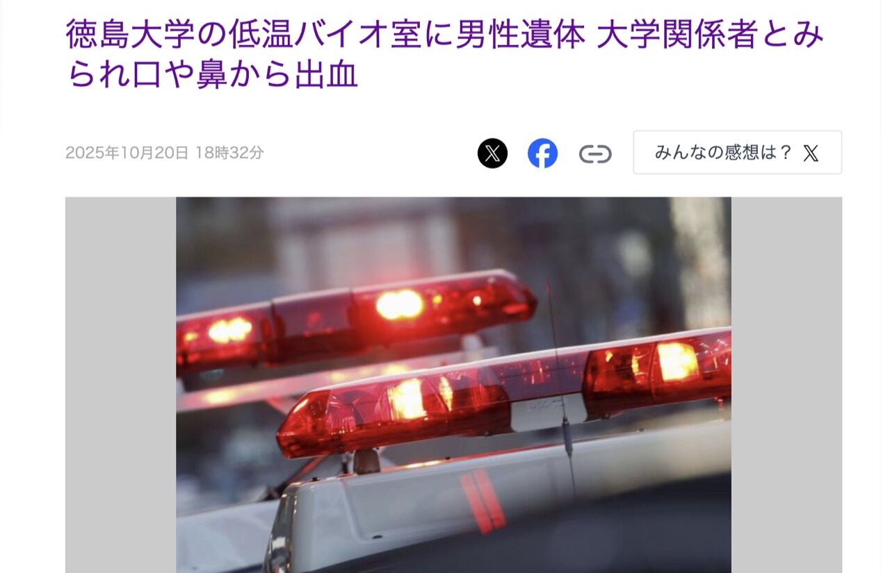 【悲報】徳島大学のバイオ室で20代男性急死 口や鼻から出血