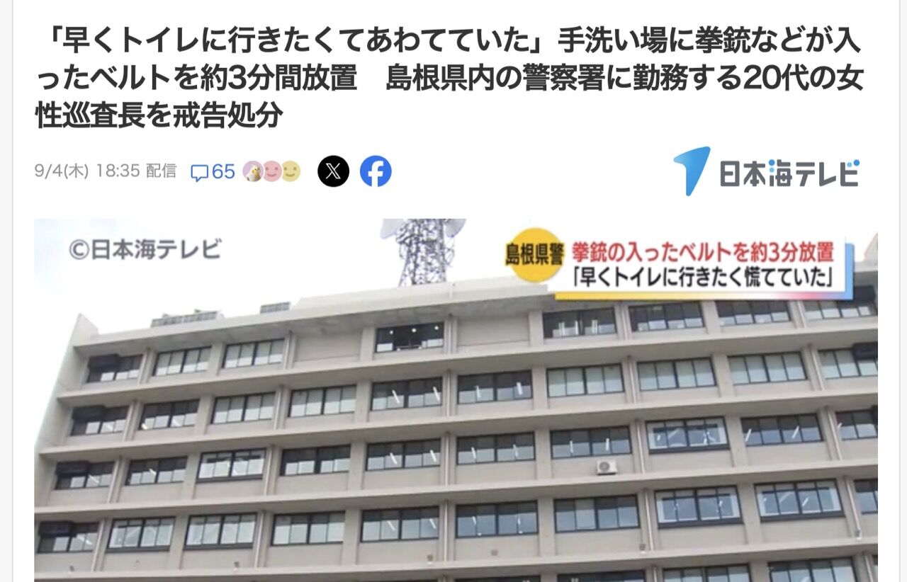 【悲報】20代女性警官さん、トイレに早く行きたくて拳銃を放置し処分